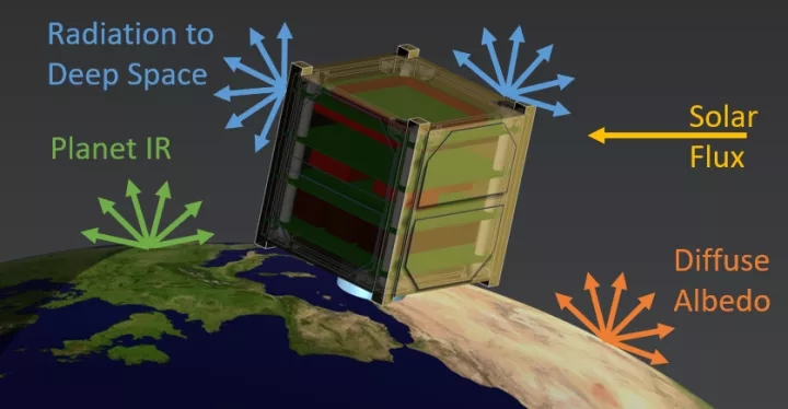 其次,對于近地軌道上的衛(wèi)星,入射到地球日光側(cè)的太陽光通量會被漫反射到衛(wèi)星朝向地球一側(cè)的表面。這些反射的大小取決于地球的局部表面特性以及不斷變化的大氣條件??偟膩碚f,漫反射太陽光通量大約是直接太陽光通量的三分之一,被稱為反照率通量。當(dāng)衛(wèi)星進入日食時,這些直接的太陽光通量和反照率載荷下降為零,但有一個第三環(huán)境熱源始終存在。地球是溫暖的,相當(dāng)于一個漫射器,其紅外輻射的大小是緯度和經(jīng)度的函數(shù)。知道這些隨時間變化的環(huán)境通量,以及它們在衛(wèi)星表面的分布,是計算衛(wèi)星溫度所需要的輸入,這涉及到求解固體部分的熱傳導(dǎo)和所有暴露表面的輻射。通常將這些環(huán)境通量分為兩個波段:太陽波段和環(huán)境波段。